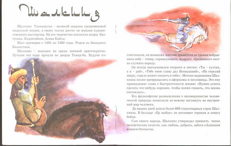 Казахские сказители-жырауЖырау - народный поэт, сказитель. "Жырау" происходит от слова "жыр" - стихотворение. Жыры исполняли талантливые певцы. Народ почитал их поэтический дар. Многие сказания (жыры) посвящены войнам, походам, жизни кочевников. Эта казахская народная поэзия XV-XVIII веков дошла до нас в устой форме. |