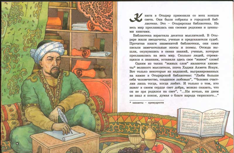 Отырарская библиотекаЗнаменитая в свое время на весь мир Отырарская библиотека, согласно легенде, была сожжена воинами Чингис хана. Но жителям города удалось спасти некоторые книги. Они положили их в кувшины и закопали в землю. Аңыз бойынша әлемге аты шыққан кітапхананы Шыңғысхан тұмені өртеп, біраз кітапты қала қорғаушылары құмыраға салып жер астына тығып сақтап қалған деседі. Қазіргі уақытта сол кітаптарды іздеу жұмыстары жүріп жатыр. |