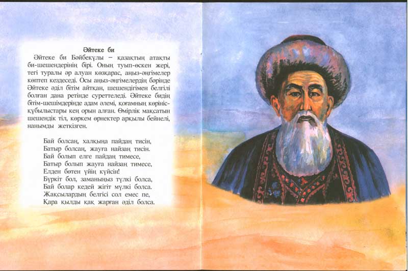 Қазақтың билеріТәуке ханның түсында ұлы жүзге - Төле би, орта жүзге - Қазыбек би, кіші жүзге - Әйтеке би басшы болып тағайындалған. Олар ел бірлігі мен жердің тұтастығына ерекше мән береді. Қоғамдық-әлеуметтік жағдайларға, тарихи оқиғаларға, адам мен оның іс-әрекеттеріне, келешек күндеріне ерекше назар аударады. Сәйтіп, ел тәуелсіздігі мен тұтастығы үшін ақылын, күш-жігерлерін, мол өмір тәжірибелерін арнаған. Казахские бии: Толе, Казыбек, Айтеке - особое значение уделяли единству страны и целостности земли. Они внесли большой вклад в дело независимости, свободы и согласия нашего народа. Особое внимание уделяли общественно-социальным условиям, историческим событиям, будущему, человеку и его действиям. Таким образом, свою мудрость, силу, энергию и свой ум, интеллект и большой жизненый опыт они использовали во благо страны, ее независимости и целостности. |