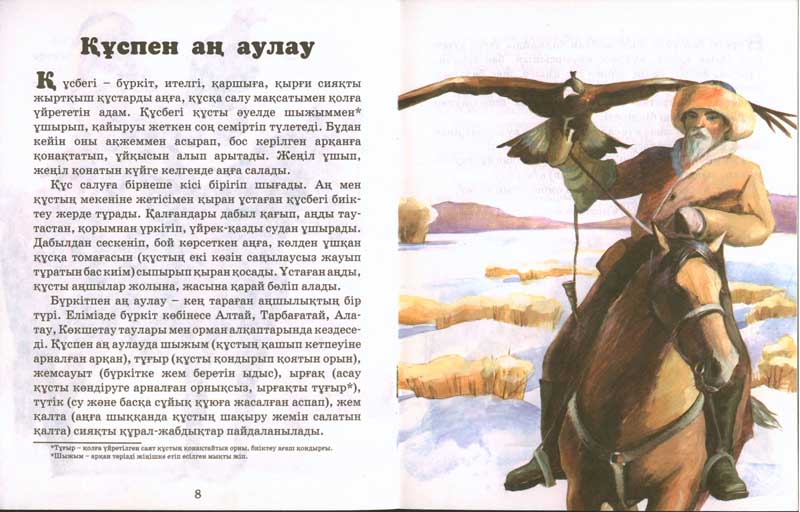 Аңшылық өнерКөне заманда аң аулаудағы негізгі қарулар тас сойыл, шоқпар, найза, садақ болған. Сонымен қатар арқан, тор, пышақ, темір қақпан (қандыауызды үлкен аңдарға және қолқақпанды кішірек аңға құратын) және сымтұзақ (суыр аулауға арналған сымнан жасалған тұзақ) сияқты құрал-жабдықтар қолданылған. |