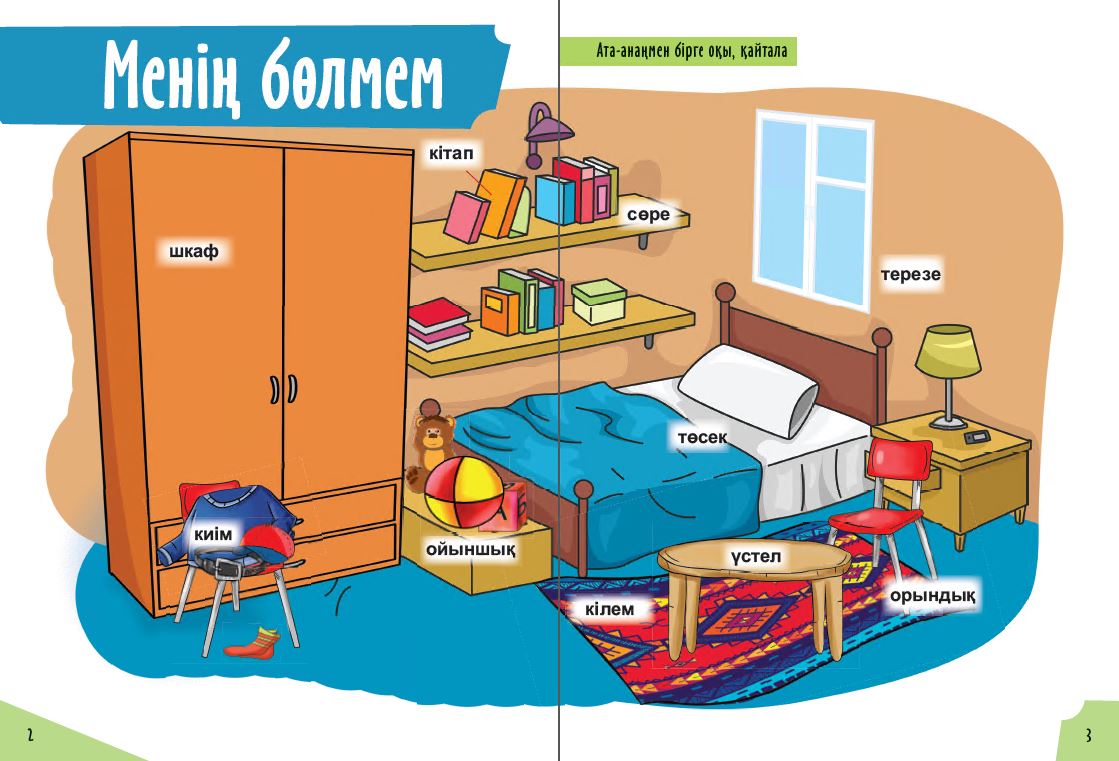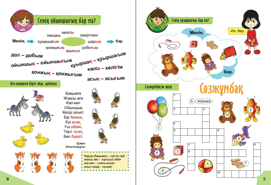 Лексическое наполнение пособия охватывает 16 тем, освоив которые, ребёнок начнёт активно использовать в своей речи 158 казахских слов.