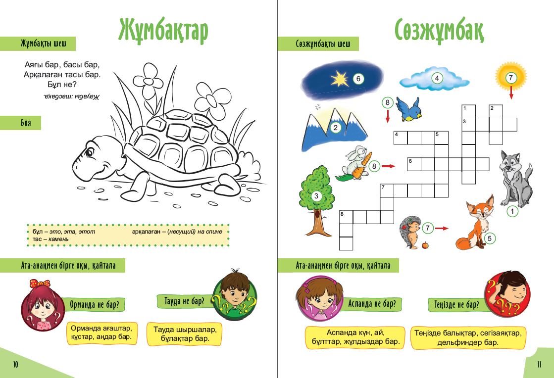 Лексическое наполнение пособия охватывает 16 тем, освоив которые, ребёнок начнёт активно использовать в своей речи 158 казахских слов.