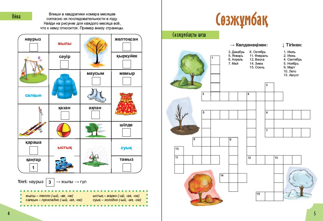 Лексическое наполнение пособия охватывает 16 тем, освоив которые, ребёнок начнёт активно использовать в своей речи 158 казахских слов.